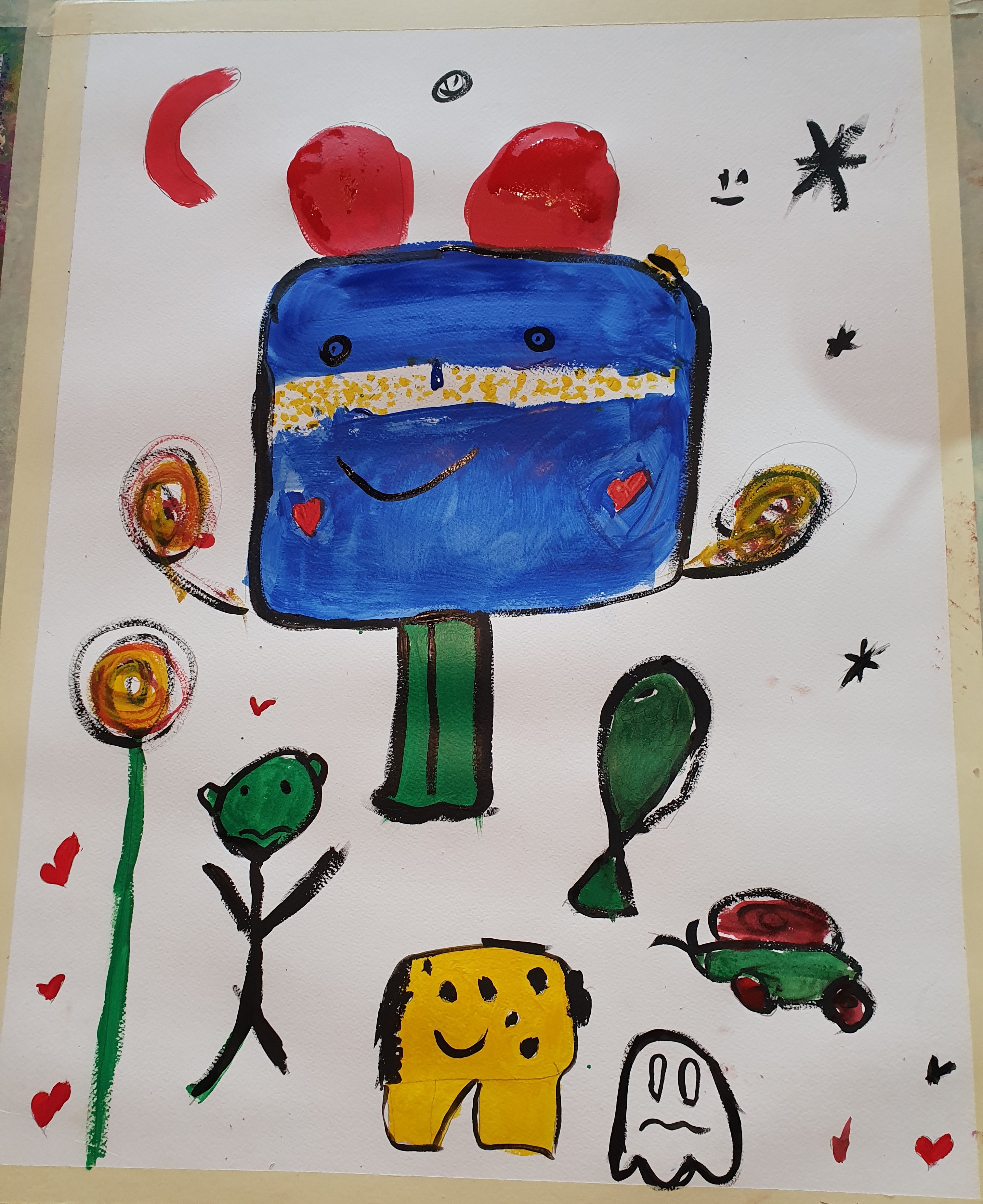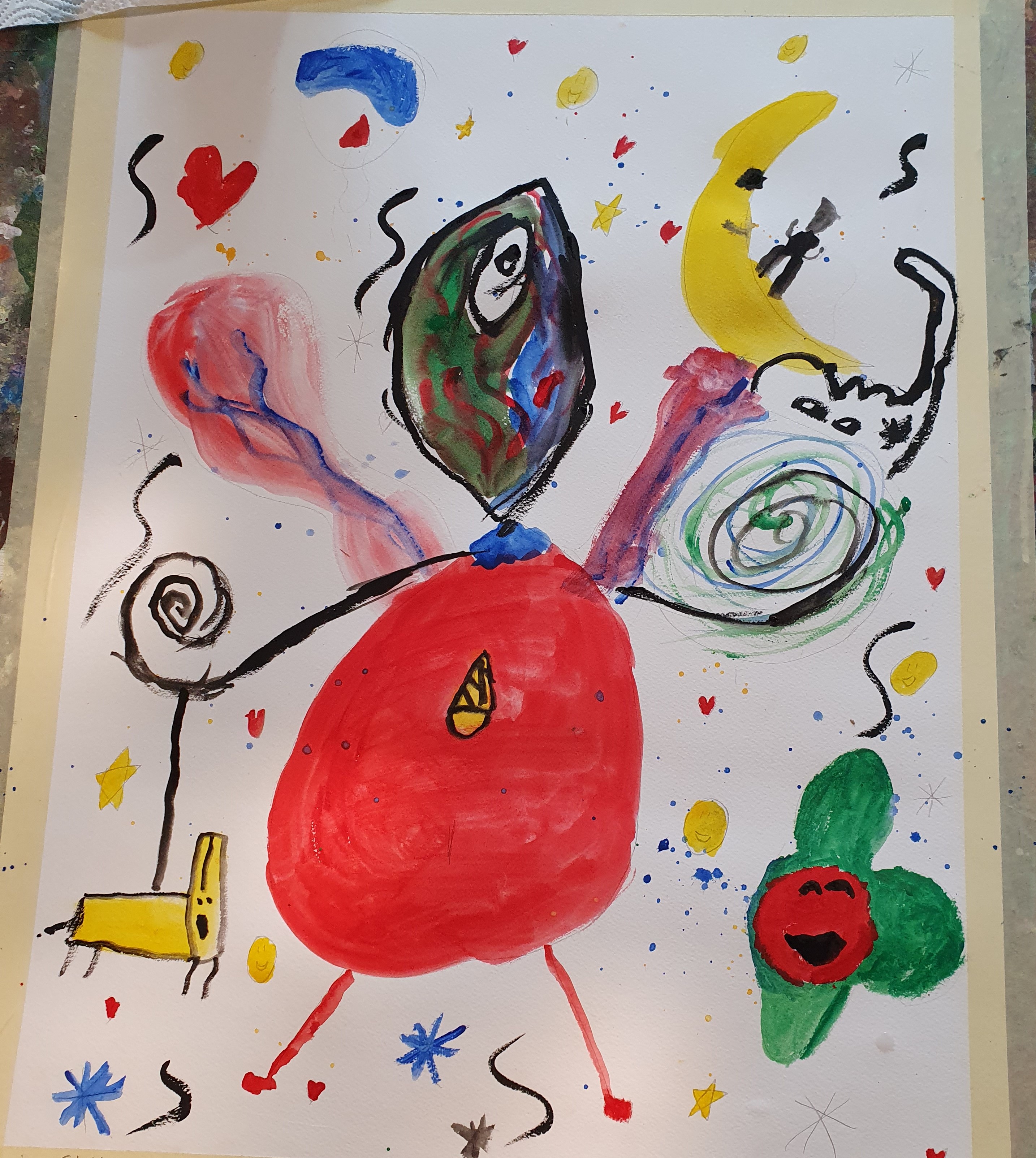 Wir haben Mittwoch den 11. September. Morgens um 9 Uhr gingen wir zur Sparkasse wo wir uns Bilder von Joan Miro angeguckt haben. Jeder hat einen Fragebogen bekommen den wir dann ausgefüllt haben. Anschließend sind wir zusammen in die Malschule gegangen und haben unserer Miro Fantasie freien Lauf gelassen. Jeder hat ein anderes Bild gemalt. Unsere tollen Bilder werden am 9. Oktober ausgestellt. Das war super cool! (Käthe)